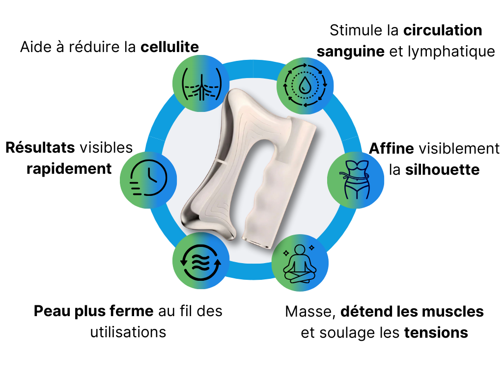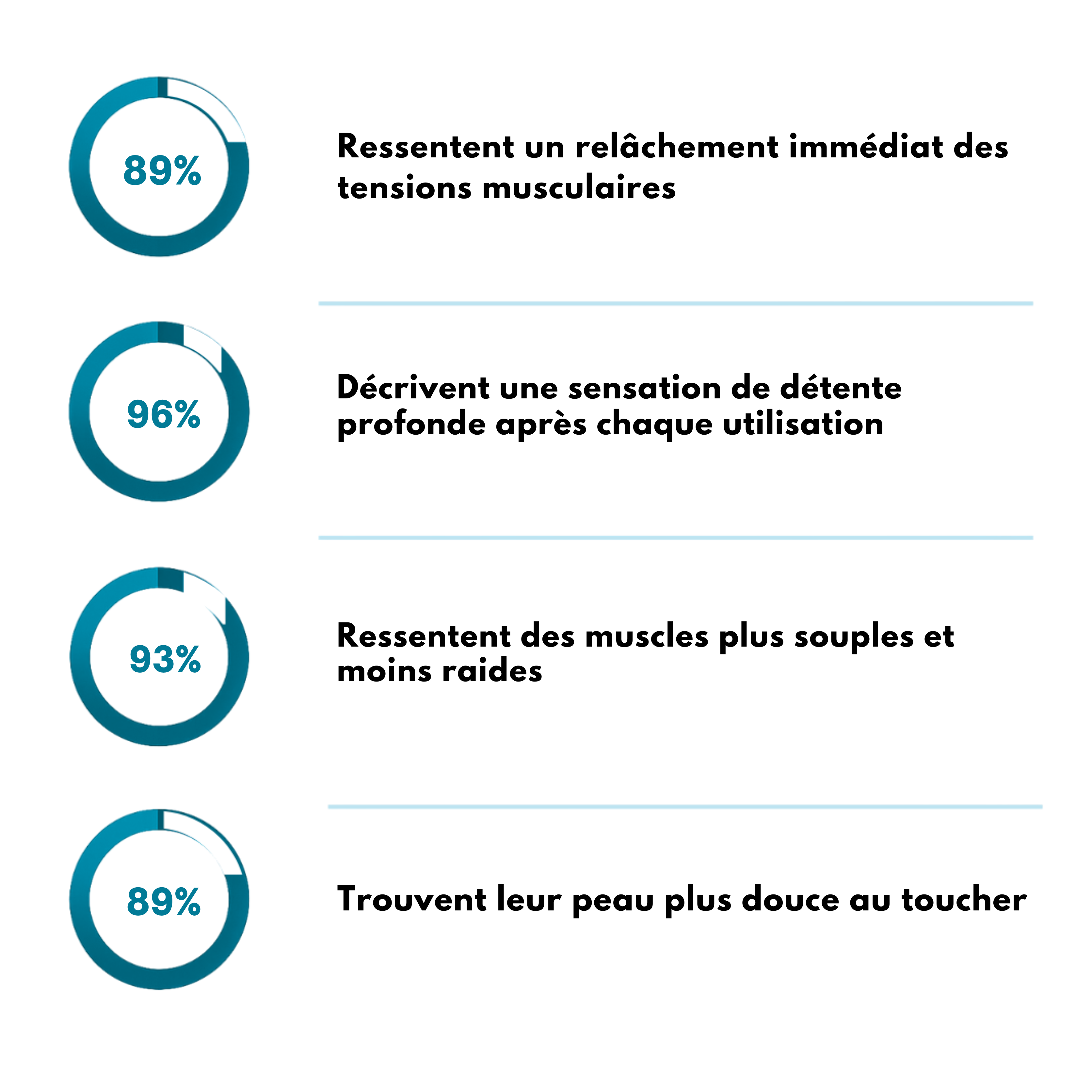 Des tests utilisateurs ont montré une peau visiblement plus lisse, une amélioration de l’aspect de la cellulite et un soulagement des tensions musculaires dès les premières utilisations.