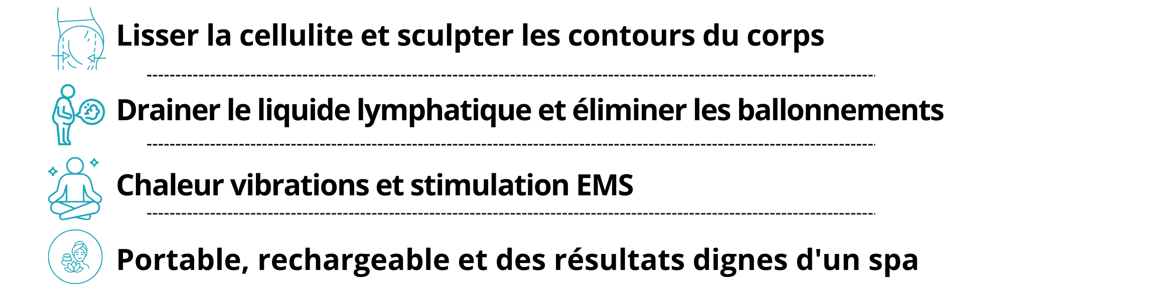 Conçu pour s’intégrer facilement à votre quotidien, ce masseur lame vous aide à améliorer l’aspect de votre peau, à atténuer visiblement la cellulite et à relâcher les tensions musculaires, le tout depuis chez vous.